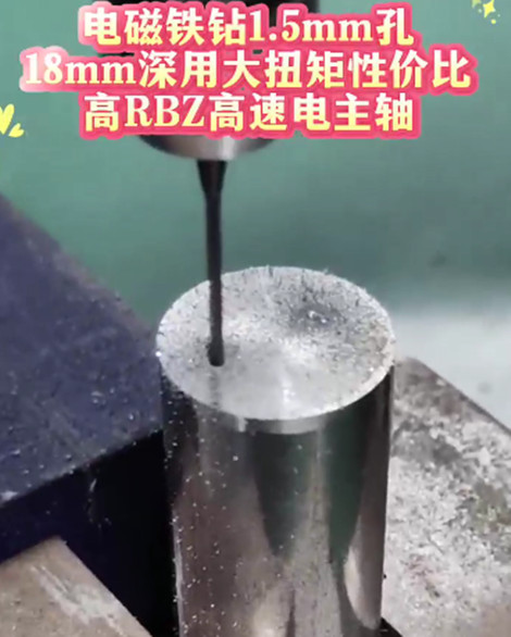圆柱型电磁铁钻1.5mm孔,深度18mm,加装排刀机可用大扭矩RBZ高速电主轴 ,扭矩高达0.2N.M,转速4万转/分,可一拖二或一拖四,性价比高。