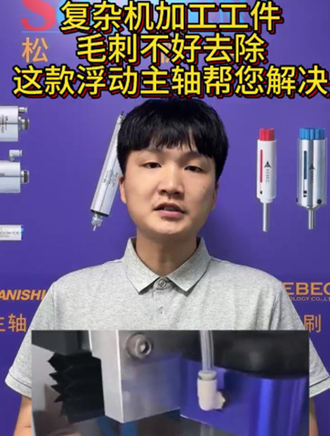 机加工后工件表面轮廓复杂,常规去毛刺方法难以去除,所以采用了我们这款浮动主轴 ,具有径向360°浮动,更好的自适应贴合加工面,使其不易过切。间接也使加工轨迹更好调整。